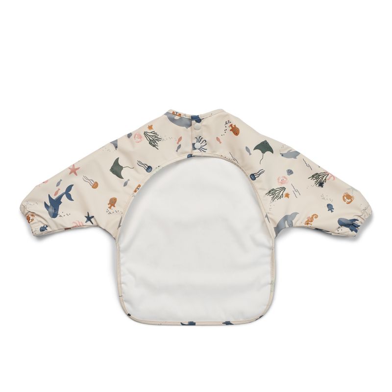 Praktisk smekke med armer og lomme som beskytter barnets klær mot søl. Smekken lukkes med 2 trykknapper i nakken, er vanntett og tørkes enkelt av etter bruk.