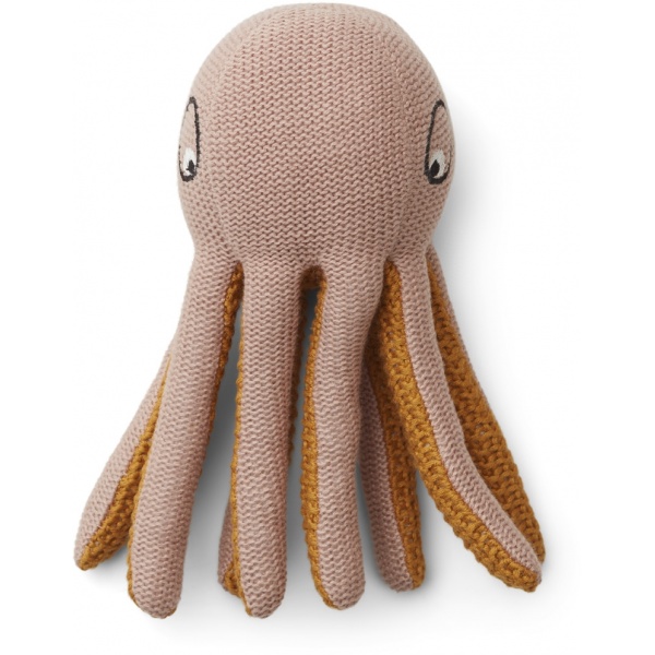 Strikket blekksprut i økologis bomull med knitrende lange armer som mini vil elske å kose med.