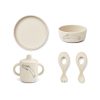 Superfint barneservise inkludert den populære Liva skje/gaffel! Myk silikon som tåler alt, inkludert å bli kastet i gulvet. Settet består av skje, kopp med tut, tallerken og skål, så fint for de minste som skal starte med fast føde, samt for de litt større. Kopper med to hanker gjør det enkelt for barnet å drikke av selv. “Anti-skli nupper” under koppen gjør at den ikke velter så lett. Koppen kan brukes uten lokk senere. Laget av myk og sikker silikon, er disse servisedelene lydløse og tåler oppvaskmaskin.