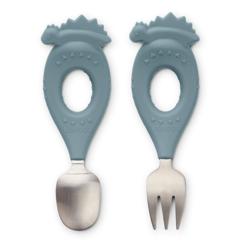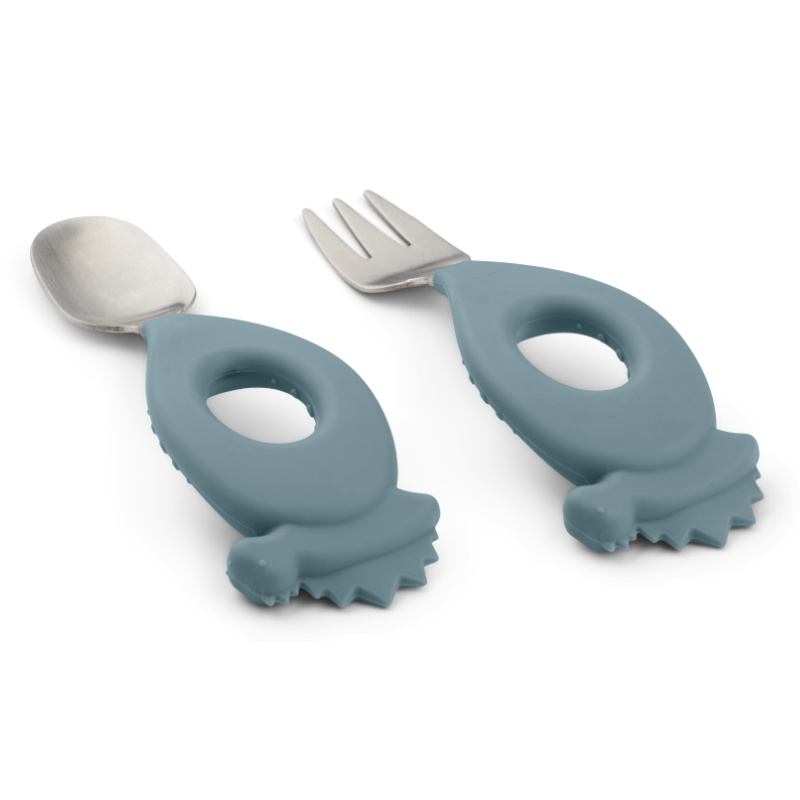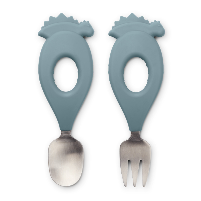 Søte skjeer i rustfritt stål og silikonhåndtak med dyr på. Skjeene er perfekte for å hjelpe små barn med å mestre å spise selv.