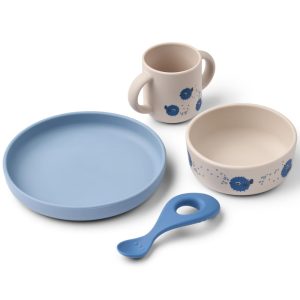 Dette superfine barneserviset inneholder alt barnet trenger for sine første matopplevelser – og det inkluderer den populære Liva-spiseskjeen! Settet består av tallerken, skål, kopp med to håndtak og skje, og er laget i slitesterk og fleksibel 100% BPA-fri silikon som tåler både røff bruk og høy varme. Perfekt for både babyens første smaksprøver og større småbarn som spiser selv.