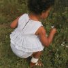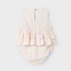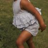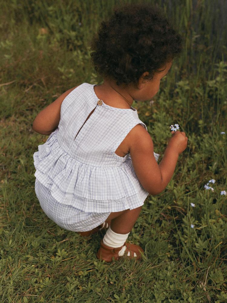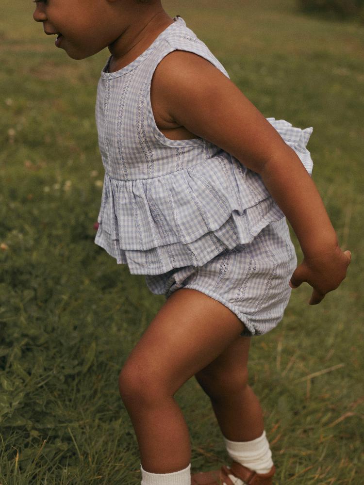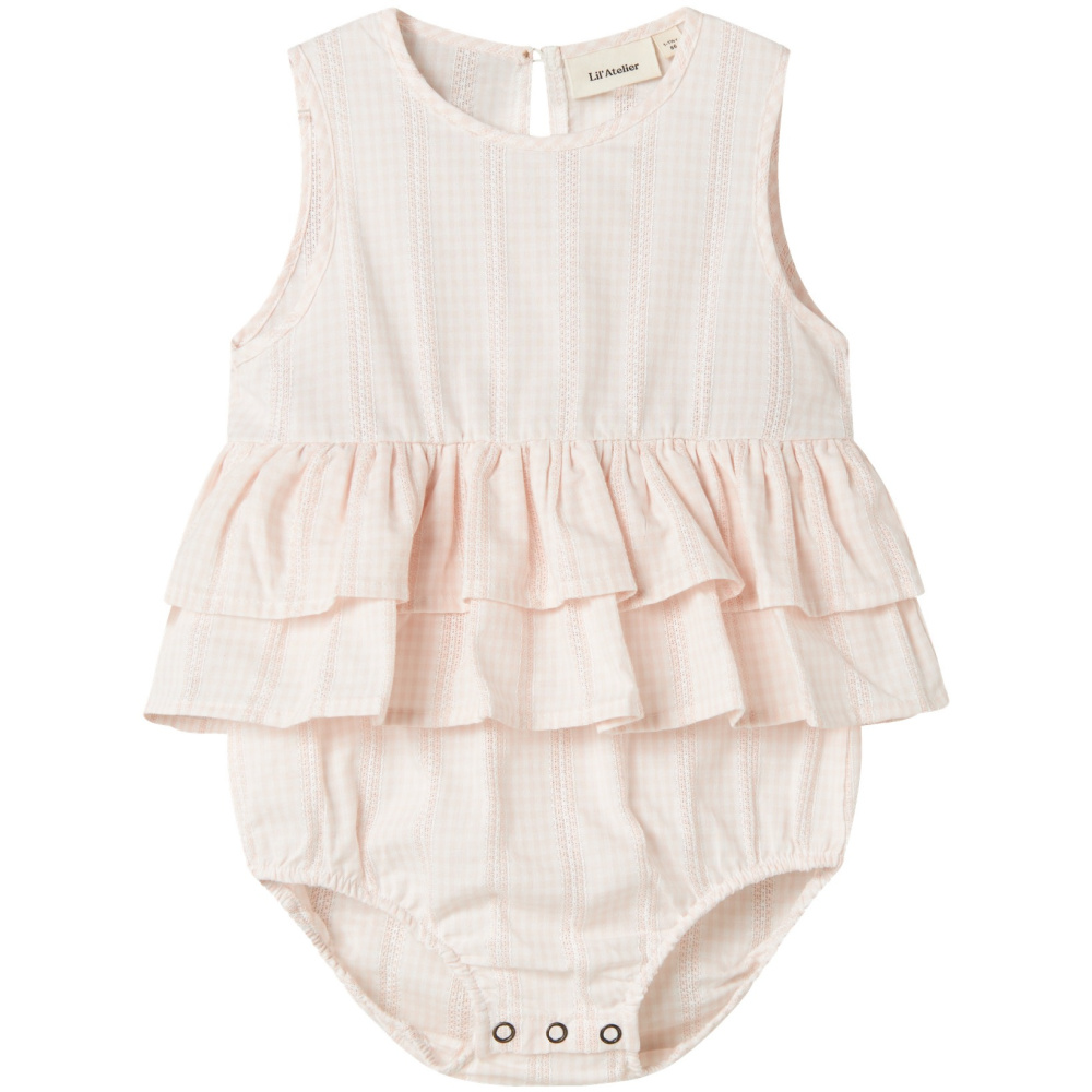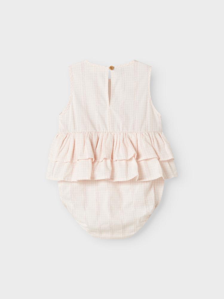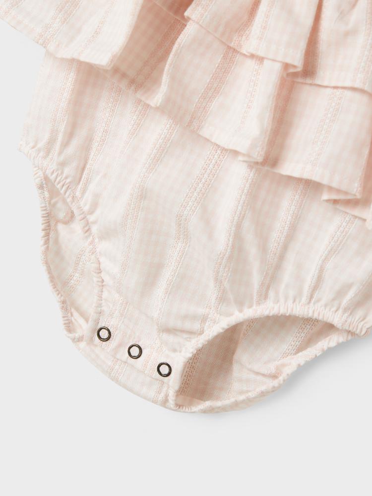 Søt og luftig ermeløs body i myk 100% økologisk bomull, perfekt for varme dager eller til å ha under en cardigan. Den vevde kvaliteten har et klassisk rutemønster og en lett tekstur som gir et delikat og tidløst uttrykk. Bodyen har rund hals, volangdetaljer på skuldrene og både knappelukking bak og trykknapper i skrittet for enkel på- og avkledning.