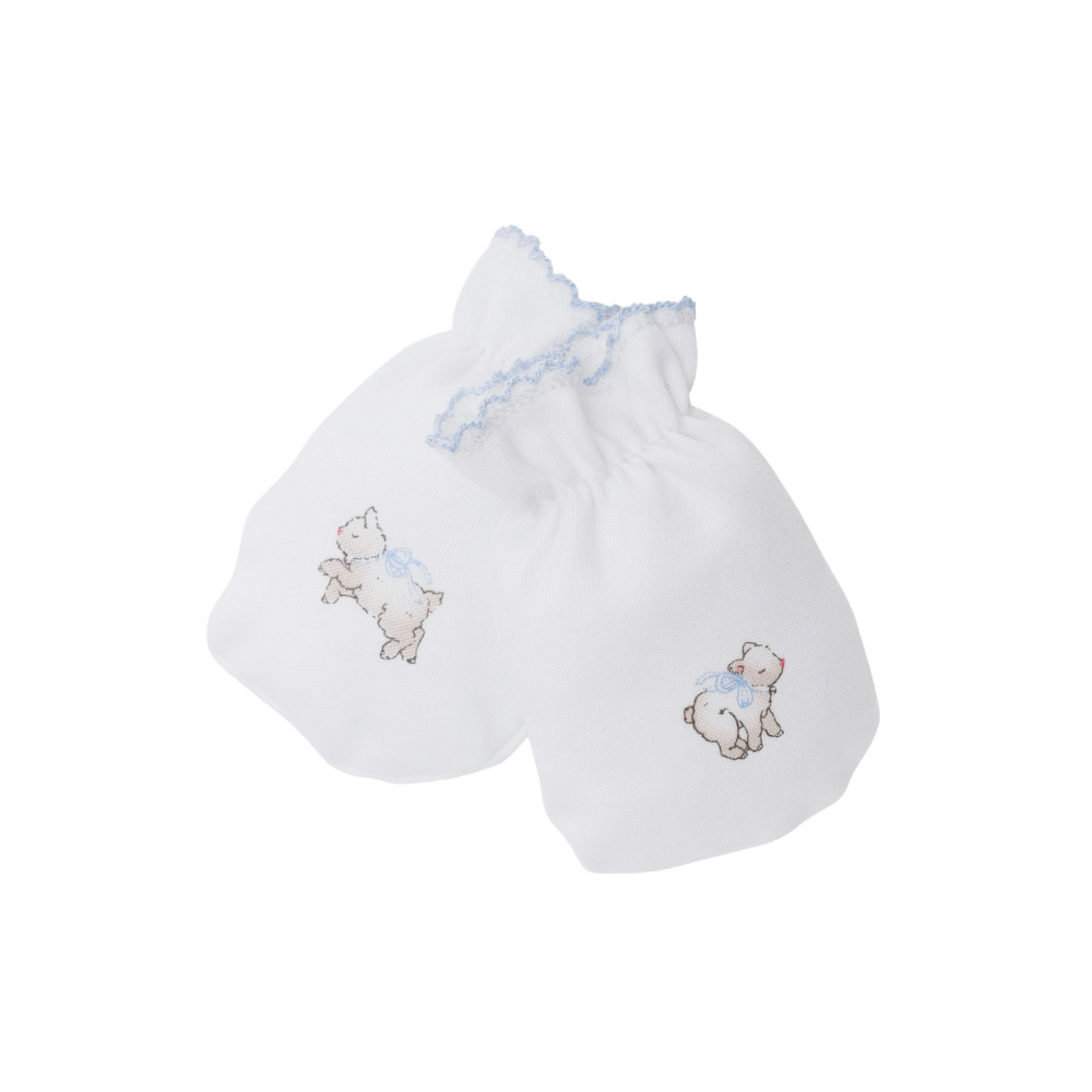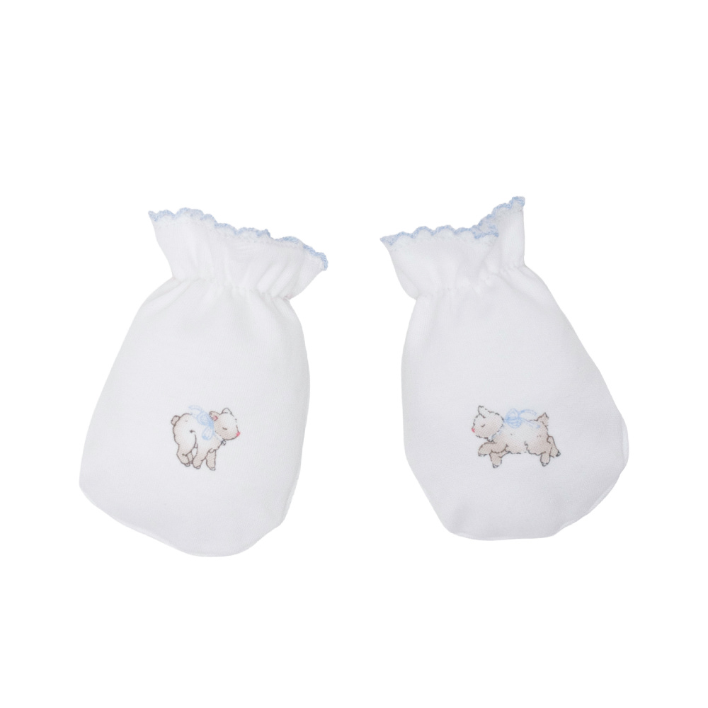 De myke klorevottene er en uunnværlig accessoir for nyfødte. De beskytter babyens sarte hud mot riper fra små negler, samtidig som de holder hendene varme og behagelige. Med elastisk mansjett, brodert kant og det søte Counting Sheep-printet blir de både praktiske og dekorative. Perfekte å matche med overall og teppe i samme print.