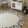 Rundt gulvteppe med alfabetet. Perfekt på barnerommet, lekerommet eller i kosekroken. Teppet er håndlaget og små variasjoner i farge og fasong kan forekomme. Gulvteppene i denne kolleksjonen kan enkelt vaskes i vaskemaskinen hjemme, helt genialt i hjem med små barn, dyr og menn.