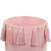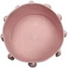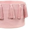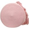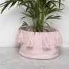 Flettet bomullskurv med morsomme dusker. Kurven er håndlaget og kan brukes til oppbevaring av bamser, bøker, klosser, pledd eller som potteskjuler til planter.