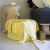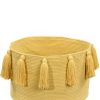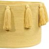 Flettet bomullskurv med morsomme dusker. Kurven er håndlaget og kan brukes til oppbevaring av bamser, bøker, klosser, pledd eller som potteskjuler til planter.