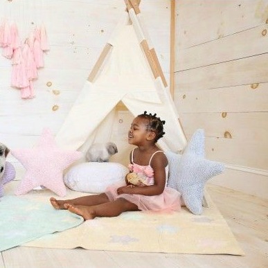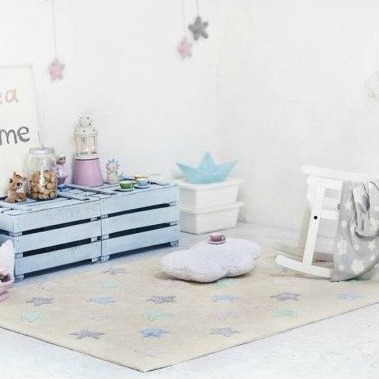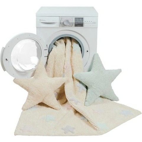 Mykt gulvteppe med stjerner. Perfekt på barnerommet, lekerommet eller i kosekroken. Teppet er håndlaget og små variasjoner i farge og fasong kan forekomme. Gulvteppene i denne kolleksjonen kan enkelt vaskes i vaskemaskinen hjemme, helt genialt i hjem med små barn, dyr og menn.
