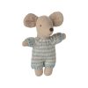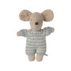 Liten babymus kledd i en myk, stripet strikkedrakt. Den ligger godt og sover i en liten vattert bærebag.