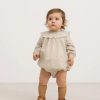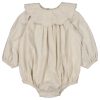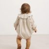 Denne løstsittende babybodystockingen kombinerer klassisk eleganse med praktisk funksjonalitet. Den har en pen krage, knappelukking bak og et vakkert broderimønster som gir et sofistikert preg. For enkel påkledning og bleieskift har bodystockingen praktiske trykknapper mellom bena.
