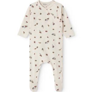 Myk og behagelig heldrakt med føtter i et søtt tog-mønster. Heldrakten har omslagslukking og praktiske trykknapper fra halsen og ned langs det ene benet, noe som gjør påkledning og bleieskift ekstra enkelt. En stretchy og pustende kvalitet som sitter godt og føles deilig mot babyens hud.