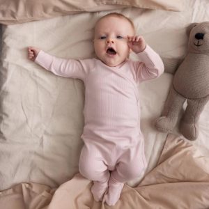 Langermet jumpsuit med føtter for nyfødte. Jumpsuiten har omslagsåpning og lukkes med trykknapper fra halsen og ned det ene benet. Den er laget i en utrolig myk og elastisk mikromodalkvalitet – perfekt for sart babyhud.