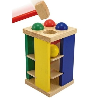 Slå de fire trækugler gjennom hullerne og se og lyt når de ruller ned for rampen. Et banketårn er altid en hit blandt mindre barn. Passer barn fra 2 år .