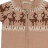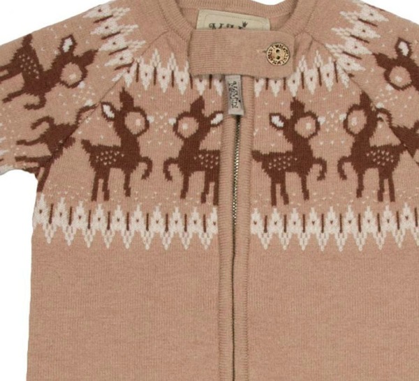 MeMini Baby overall er en strikket heldress med mønster av dådyr. Dressen har glidelås i front og en knepping i halsen. Dressen er laget av 80% lammeull og 20% polyamid. Produktet er normalt i størrelsen, og er sertifisert med Oeko-tex standard 100. Produktet er også testet for giftstoffer i produksjon.