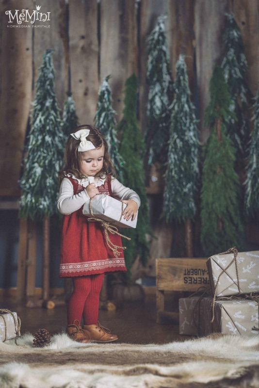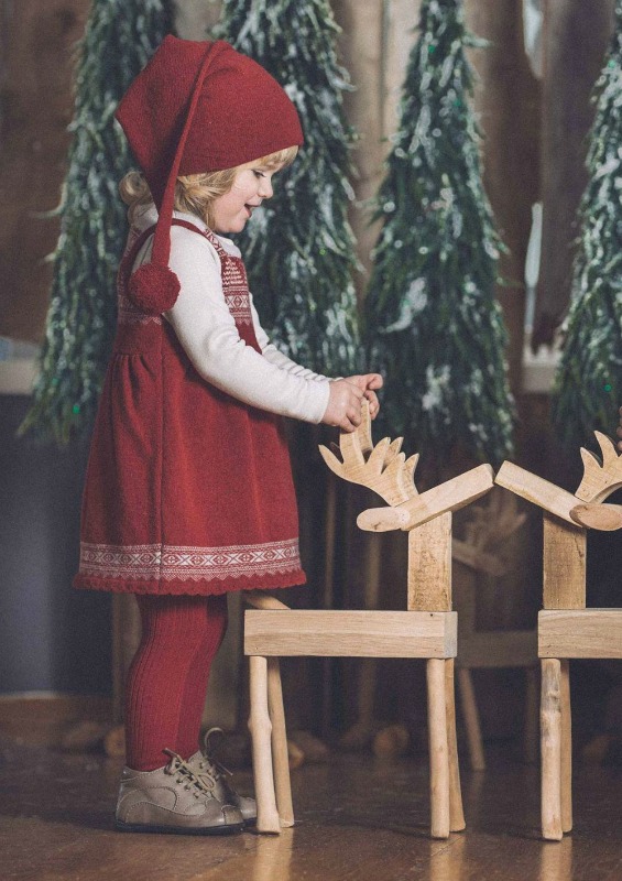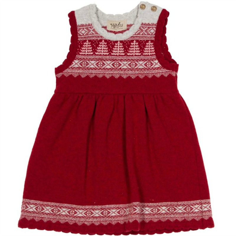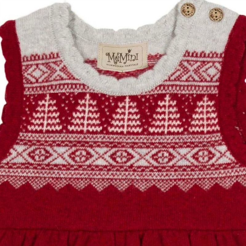 Pine Knit Dress er en nydelig strikkekjole i ull med mønster. Fargen er en nydelig, dyprød farge, med mønster i naturhvitt og grått.