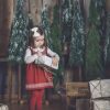 Den er finnes i rødt med grått og naturhvitt mønster.