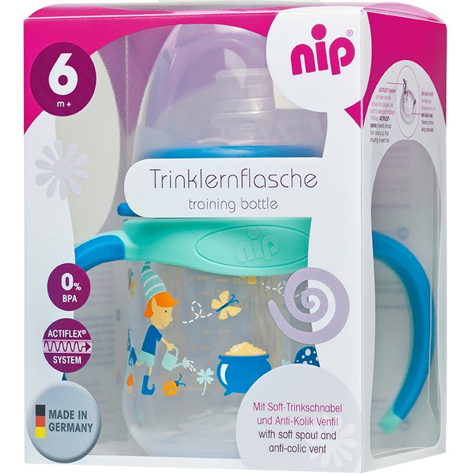 Fin tutekopp med håndtak og dryppsikker tut. Myk tut som er skånsom mot tennene.
