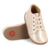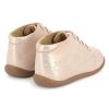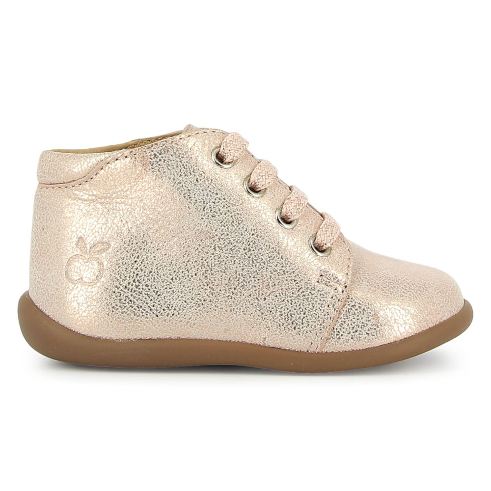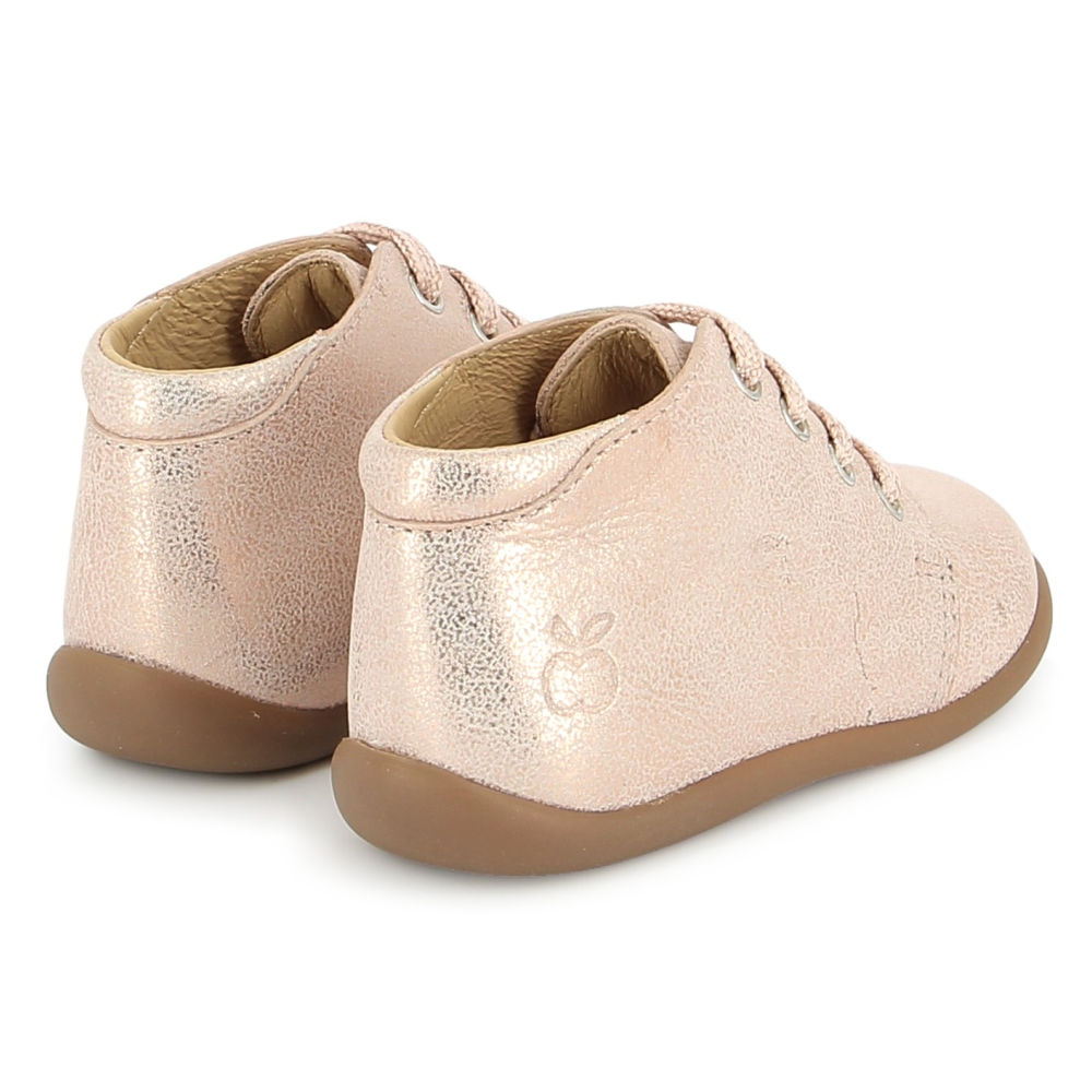 Modellen er fremstilt i mykt, rosa lær som kombinerer eleganse og funksjonalitet. Både krage og tunge er polstret for ekstra komfort, og snøringen gir et presist og stabilt hold. Den brede åpningen gjør skoen enkel å ta av og på – perfekt for små som er i ferd med å lære å gå.
