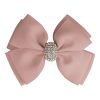 - Materialer: Grosgrain-bånd, metallklype med antiskli, Swarovski-rhinestone knapp