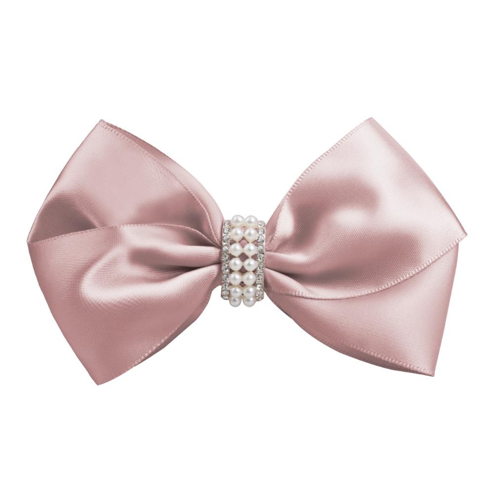 - Materialer: Grosgrain-bånd, metallklype med antiskli, Swarovski-rhinestone og perleknapp