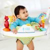 Sittedelen kan roteres 360 grader slik at barnet kan snurre i alle retninger for å utforske omgivelsene. Den lysende boksen spiller musikk og har fine dyrelyder. De interaktive lekene plasseres rundt kanten og oppmuntrer til utvikling og gir en lærende lekestund. Lekene kommer i sterke farger som stimulerer visuelt og holder barnet interessert over en lengre periode. Når leketiden er over så kan man enkelt slå sammen hoppegyngen for smidig oppbevaring.