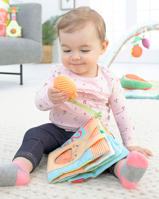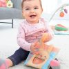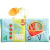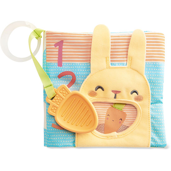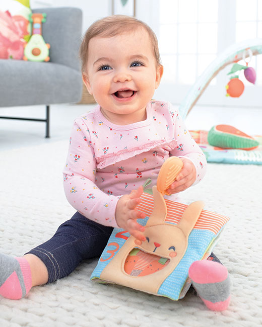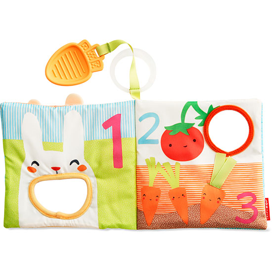 En aktivitetsbok med myke tøysider fylt med sansefelter, rangle og speil som vekker nysgjerrighet, og trener motorikken. Lek tittei med kaninen og regne til 10 med bondegårdens grønnsaker og frukter. I en snor henger en bitelek formet som en gulrot for kløende gommer.