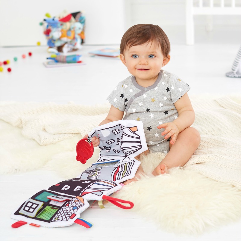 Vibrant Village aktivitetsbok er både en bok og et hus. Den har mange spennende aktiviteter som vinduer, dører, speil, bitering og lyd.