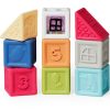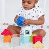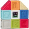 Vibrant Village byggeklosser er morsomme å stable og klemme på. Settet inneholder ni byggeklosser hvor en av klossene har reflekterende materiale og perler på innsiden. Byggeklossene har ulike bilder og struktur på alle sider, de lager også lyd når man klemmer på de. Det følger med en liten veske som klossene kan oppbevares i når leketiden er ferdig.