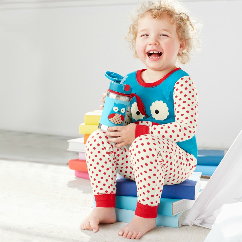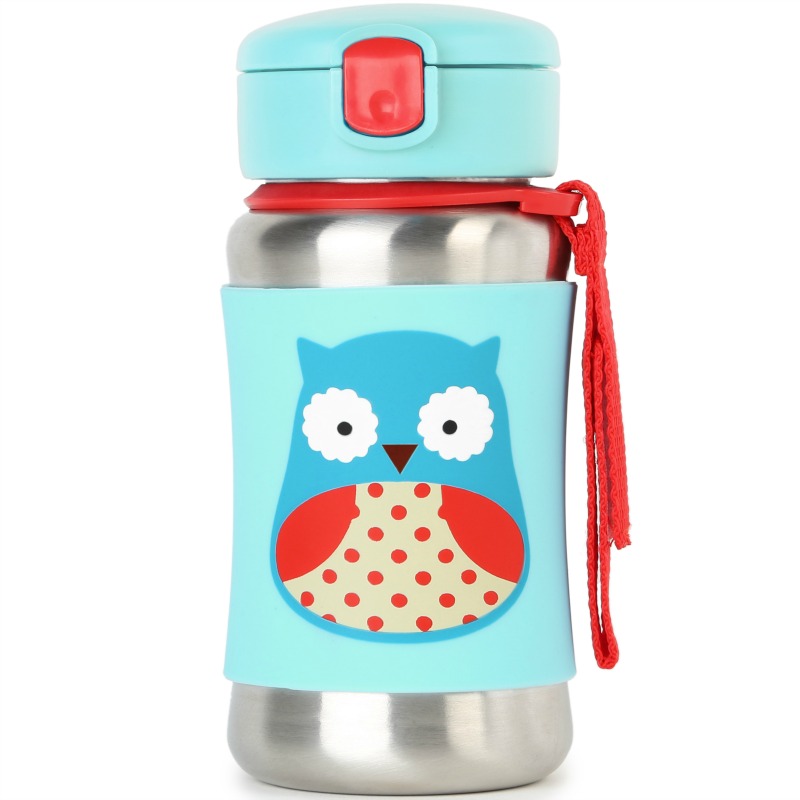 Skip Hop Zoo flaske i rustfritt stål med sugerør. Silikonbeltet gir bedre grep for små hender og lokket er ekelt å åpne og lukke. Stroppen med borrelås gjør så flasken enkelt kan henges på sekken eller på vognen.