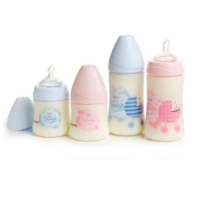 Søt flaske fra Suavinex med silikon-sutt. Finnes i blå og rosa.