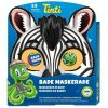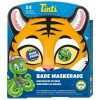 Tinti Bademaskerade inneholder fem forskjellige badeopplevelser fra Tinti. Pakken består av 3 badefarger (blå, rød og gul) samt 2 knitrebad. Esken har en maske man kan klippe ut og barnet kan ta den på. Ulike dyremotiv utenpå eskene; sebra, løve eller ape – det er mulig å skrive ønsket motiv i kommentarfeltet!