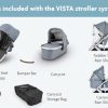 VISTA er en generøs duo-pakke der følgende inngår: chassis (understell med hjul og handlekurv), liggedel med praktisk oppbevaringsveske, sittedel med kalesje og svingbar bøyle samt regntrekk og myggnett til både ligge- og sittedel.