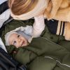 For å gi barnet ditt en myk og lett vognpose, holder materialkombinasjonen av dun, fjær og myk bomull barnet ditt varmt på kjøligere dager. Dunet er blandet med fjær for å skape en behagelig beskyttelse for barnet ditt. Mens dun fungerer som et isolerende lag, beskytter fjær mot fuktighet og vind.