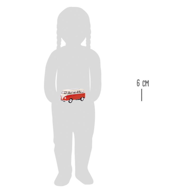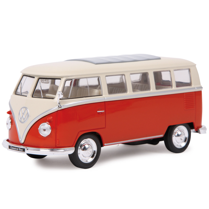 Modell av den legendariske Bully fra WV. Bussen har fyker avgårde når du trekker den tilbake og sidedøren åpnes.