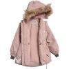 Nydelig vinterjakke med strikk i ryggen til små jenter. Jakken har avtakbar hette med fuskepels som også enkelt kan tas av. Jakken lukkes med glidelås foran, har lommer i sidene og mange reflekser.