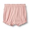 Søt pointelleshorts i 100% økologisk bomull, føles myke og behagelige mot sart babyhud. Shortsen har en vakker ribbestruktur med delikat pointellemønster og små blondekanter nederst på bena. Den justerbare elastikken i den brede midjen gir en perfekt passform, mens den løse passformen rundt bena sørger for god bevegelighet og komfort. De elastiske kantene gir en søt og luftig silhuett, samtidig som de holder shortsen godt på plass.
