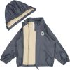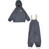 Praktisk regntøysett med matchende jakke og selebukser. Regnjakken har hette og elastikk i ermene. Buksene har justerbar seler og elastiske bånd under føttene. God passform som gir plass til godt med tøy under.
