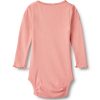 Søt langermet rib body i myk økologisk bomull og blondekant rundt halsåpningen og på ermene. Knapping på venstre skulder og rynker foran.