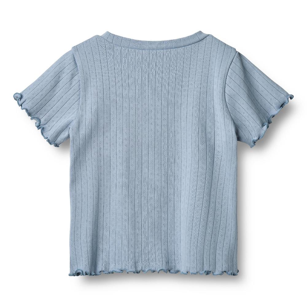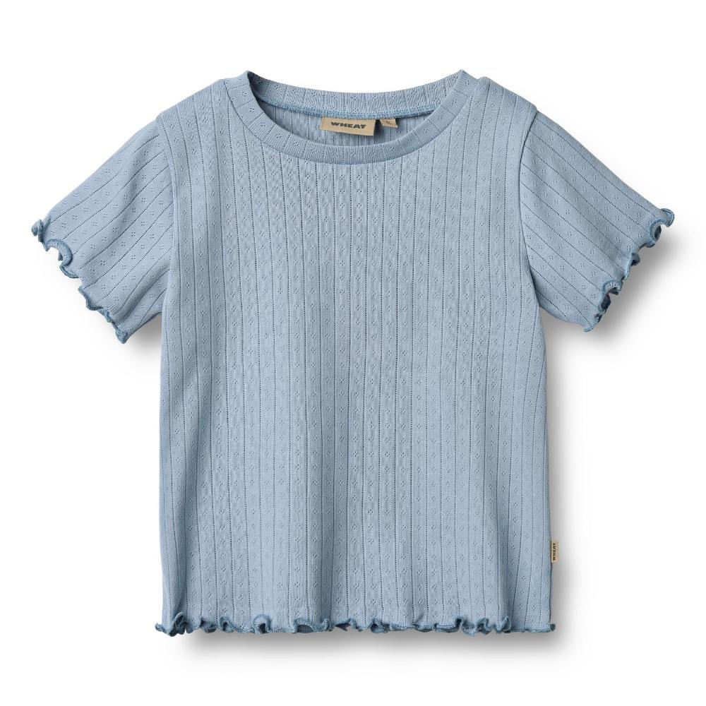 Denne kortermede T-skjorten fra Wheat er laget av myk, økologisk bomull med et delikat pointelle-mønster som gir et sjarmerende uttrykk. Med en regular/loose fit og overlockede kanter ved ermene og nederst, kombinerer T-skjorten komfort og stil på en naturlig måte.
