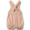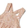 Søt rompershorts i 100 % økologisk bomull, føles myk og behagelig mot babyens hud. De brede stroppene krysser elegant på ryggen og kan justeres med knapper for en perfekt passform. Romperen har elastiske benåpninger og praktiske trykknapper i skrittet som gjør det enkelt å kle på og av babyen.