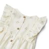 Kle den lille i myk komfort med en ermeløs romper, laget av 100% økologisk bomull. Denne nydelige romperen har et søtt, håndtegnet print med små vevde prikker og romantiske detaljer som volanger på skuldrene og rynking under midjen. Den elastiske kanten nederst gir en god passform, mens knappe- og trykknapplukking gjør av- og påkledning enkel.